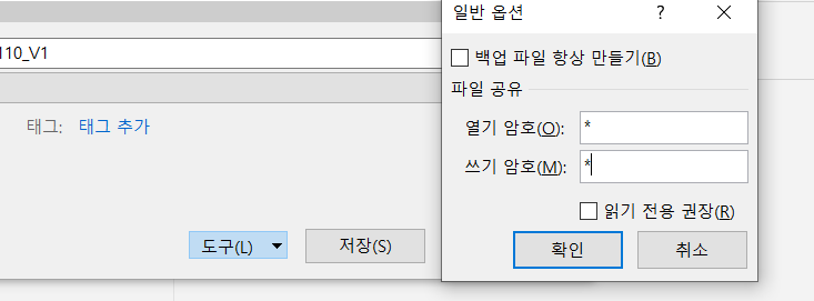 - 엑셀 파일 저장할때 밑의 사진과 같이 저장-> 도구 -> 옵션에서 암호 설정하면 파일을 열때 암호가 적용된다.